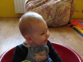 4. Ближче до шести місяців малюк починає сидіти і пробувати повзати. Він добре бачить, чує, вистачає руками, любить кидати предмети на підлогу.