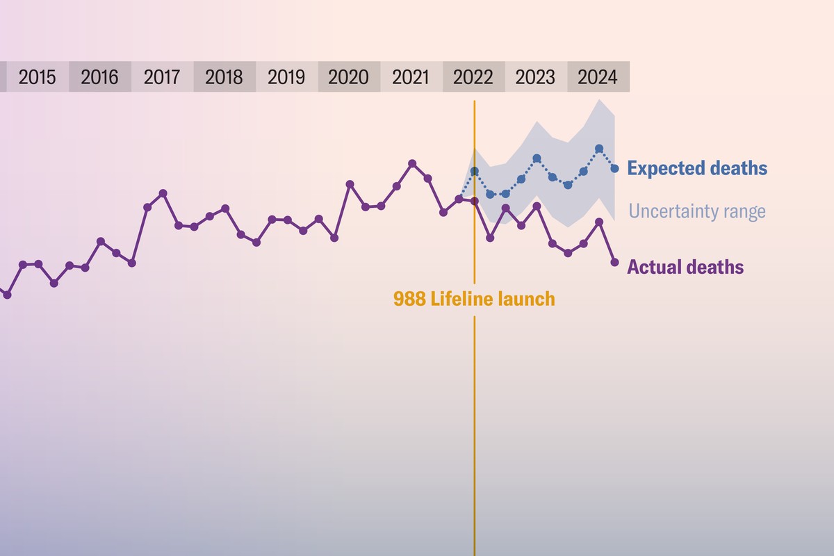 • Смертність нижче очікуваної: Дослідники порівняли фактичну кількість самогубств зі статистичною моделлю того, якою була кількість смертей, якби запуск 988 не відбувся.